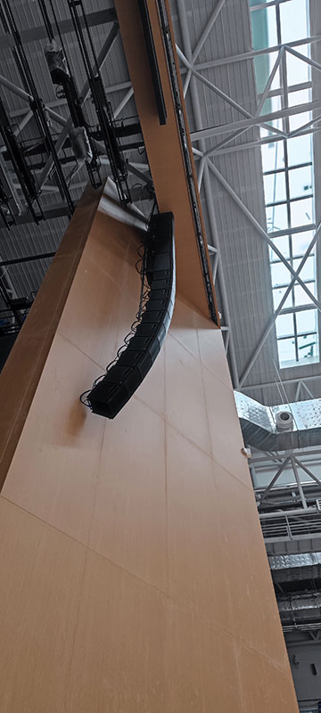 Unter dem Dach der Haupthalle hängen in etwa 14 Metern Höhe (Bumperframe) drei Array-Systeme im 90° Winkel zueinander. Mit je 6 M-F3A PRO Lautsprechern und je zwei M-F3A FS Flysubs pro Array gelingt es, die Tribünen insgesamt homogen und druckvoll zu beschallen.