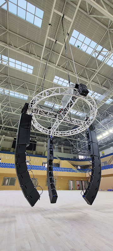 Unter dem Dach der Haupthalle hängen in etwa 14 Metern Höhe (Bumperframe) drei Array-Systeme im 90° Winkel zueinander. Mit je 6 M-F3A PRO Lautsprechern und je zwei M-F3A FS Flysubs pro Array gelingt es, die Tribünen insgesamt homogen und druckvoll zu beschallen.
